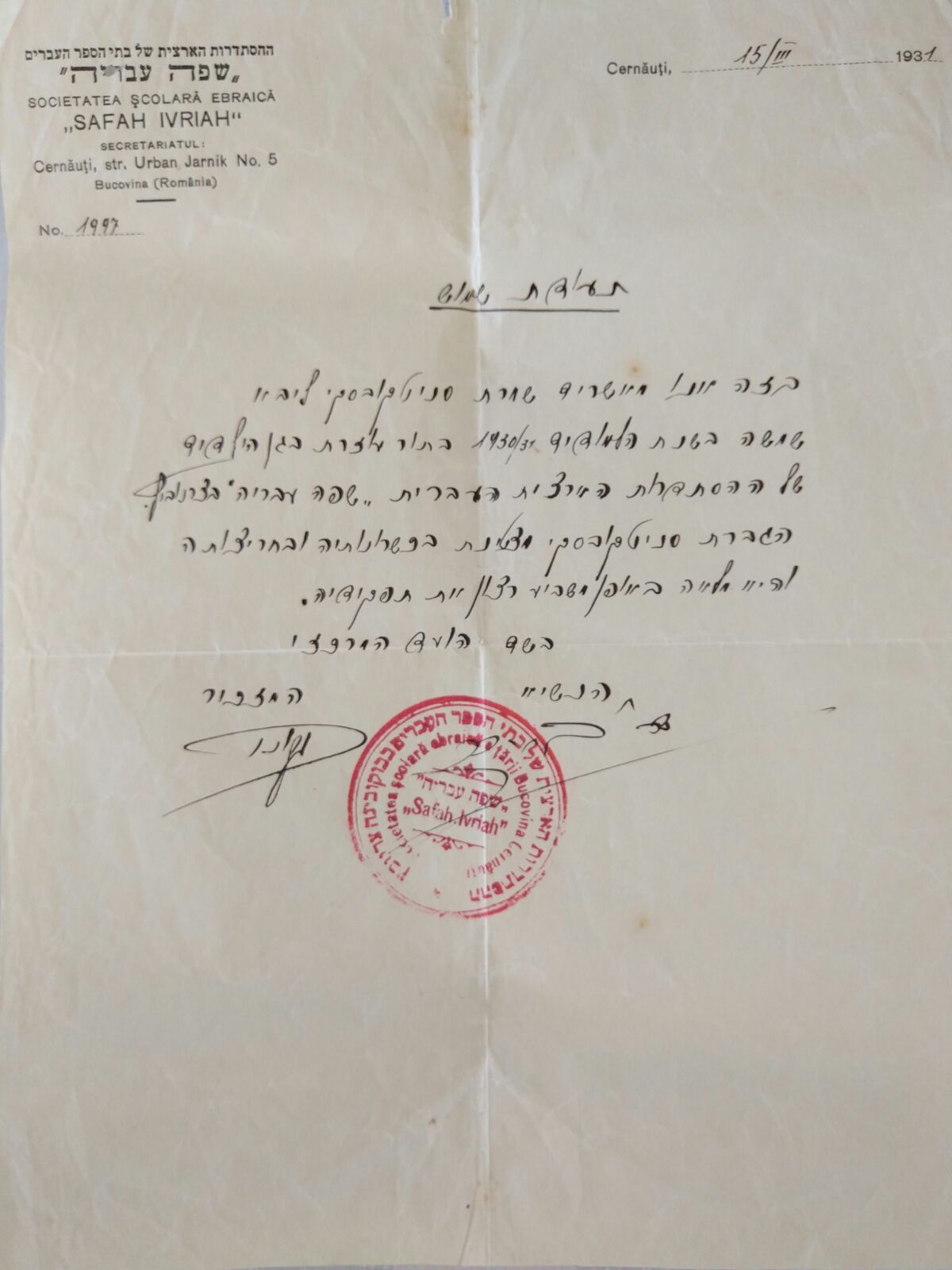 ![]() אישור עבודה כעוזרת גגנת מוצלחת בגן הילדים "שפה עבריה" בצ'רנוביץ |