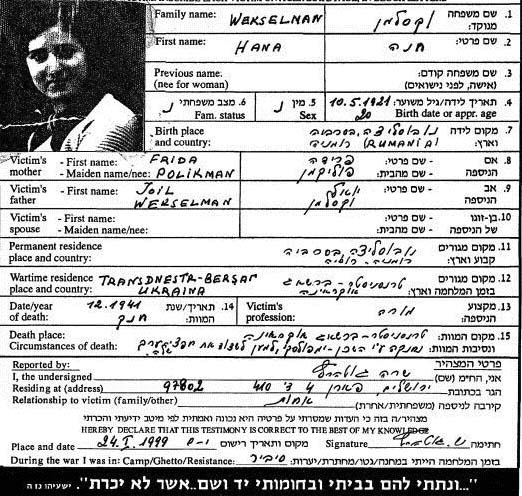 בתם, חנה, שנשארה בנובוסליצה, גורשה עם יהודי בסרביה לטרנסניסטריה. על סופה - אפשר ללמוד מ"דף-העד" שכתבה לזכרה אחותה, שרה: חנה הגיעה עם הגולים לברשאד. שם, בשלב כלשהו - היא נחנקה למוות על-ידי השכן, שרצה לשדוד את חפצי-הערך שלה. השם ייקום דמה!