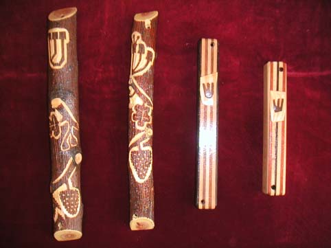 בתי מזוזה מעץ טבעי :מימין לשמאל הדבקת עץ, עיטורי שבעת המינים מעץ אזדרכת |